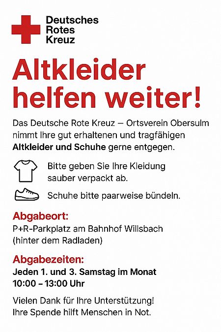 Das Deutsche Rote Kreuz - Ortsverein Obersulm - nimmt Ihre gut erhaltenen und tragfähige Altkleider und Schuhe jeden 1. und 3. Samstag im Monat am P+R-Platz Bahnhof Willsbach in der Zeit von 10 bis 13…